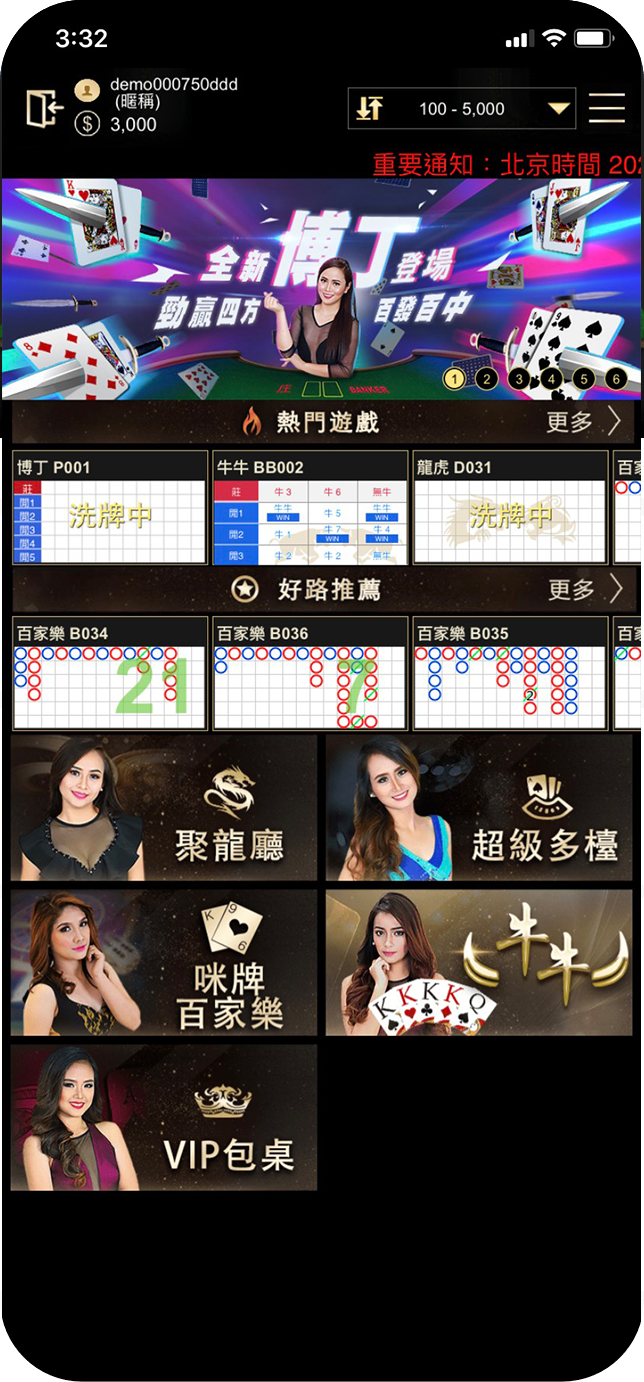 歐博真人視訊現場位於菲律賓,而真人遊戲平台主要分為四大廳包括聚龍廳、超級多檯廳、VIP包桌、競咪廳,遊戲包含百家樂、博丁、牛牛、龍虎;每個遊戲廳均具有不同的特色與功能,務求滿足各類玩家的需要,讓玩家安坐家中,便能享受超越真實Online 遊戲的精彩刺激。